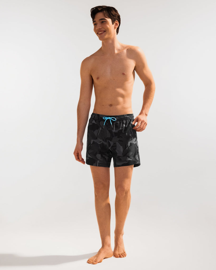 Ease into summer with swim trunks that balance calm style and bold spirit. A minimalist outer shell reveals a vibrant geo print lining. Perfect for beach days, poolside lounging, or spontaneous getaways. Comfort meets surprise in every splash and step.
