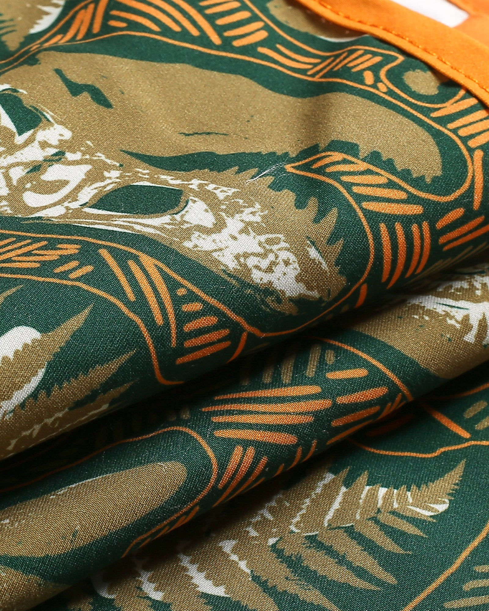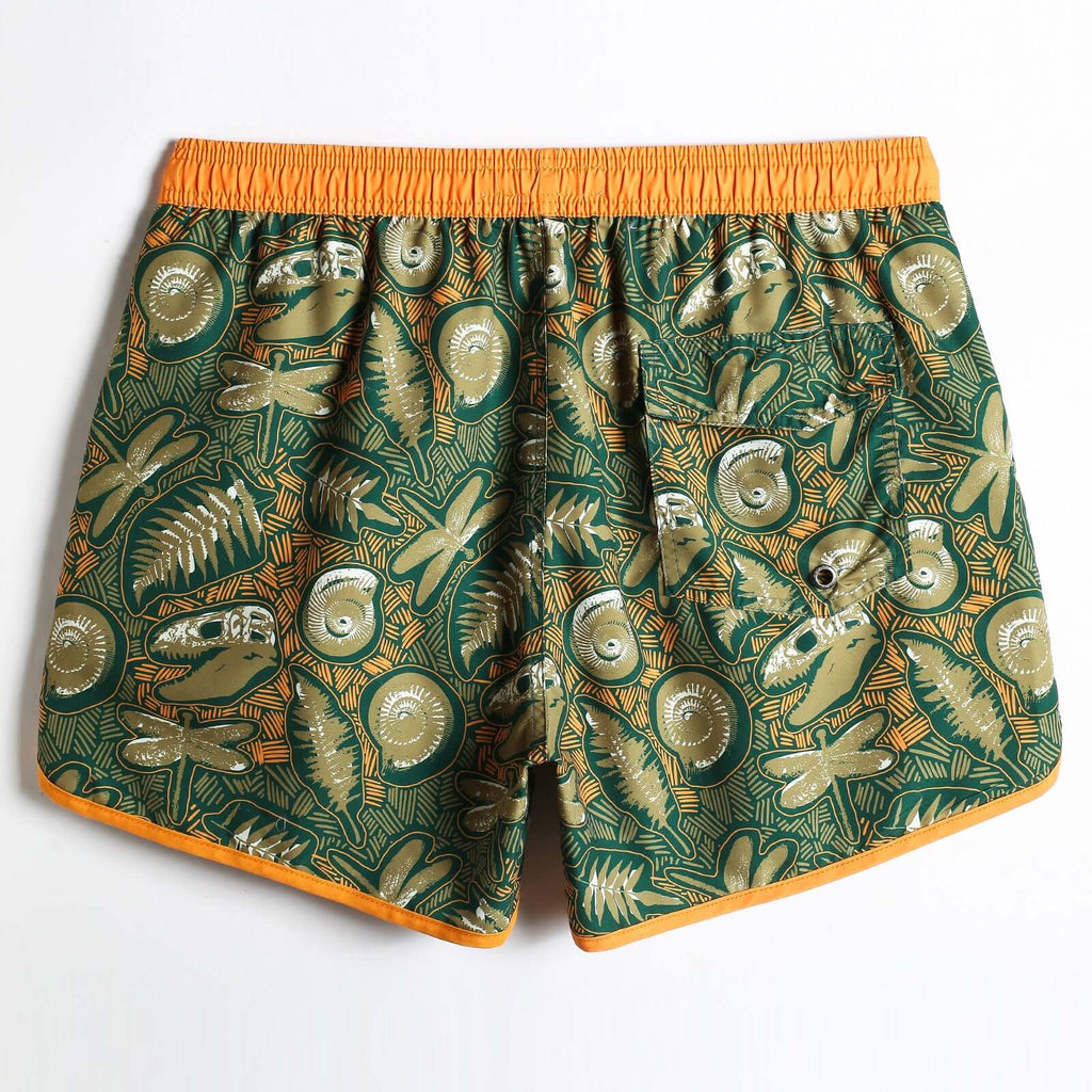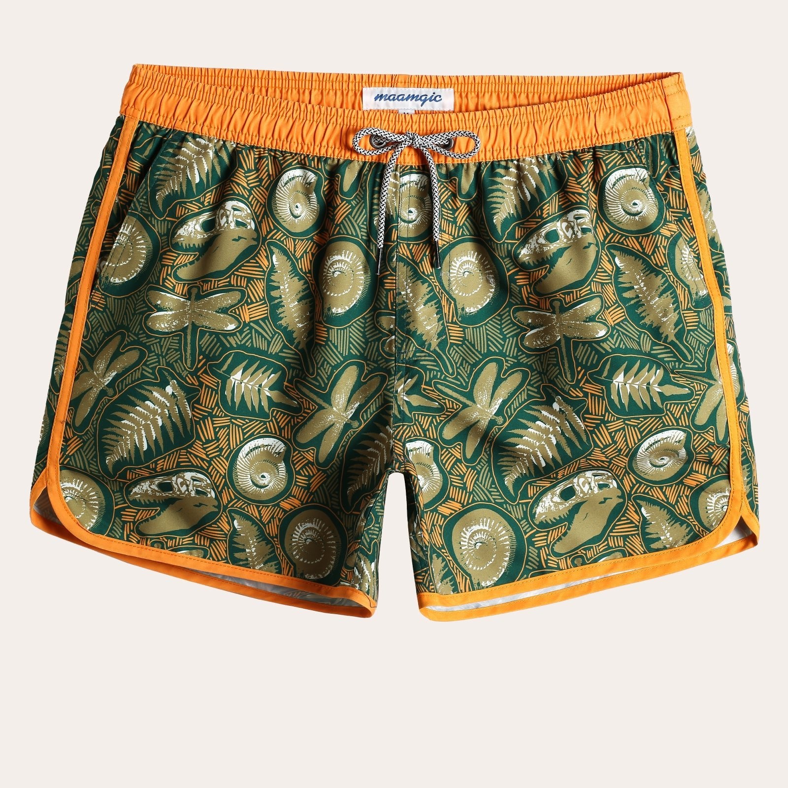 Unleash your wild side with our Men's 4.5" Vintage Swim Trunks. Featuring a bold dinosaur fossil and T-Rex skull print, these retro short swim shorts bring 90s vibes and quick-dry comfort to your summer adventures."