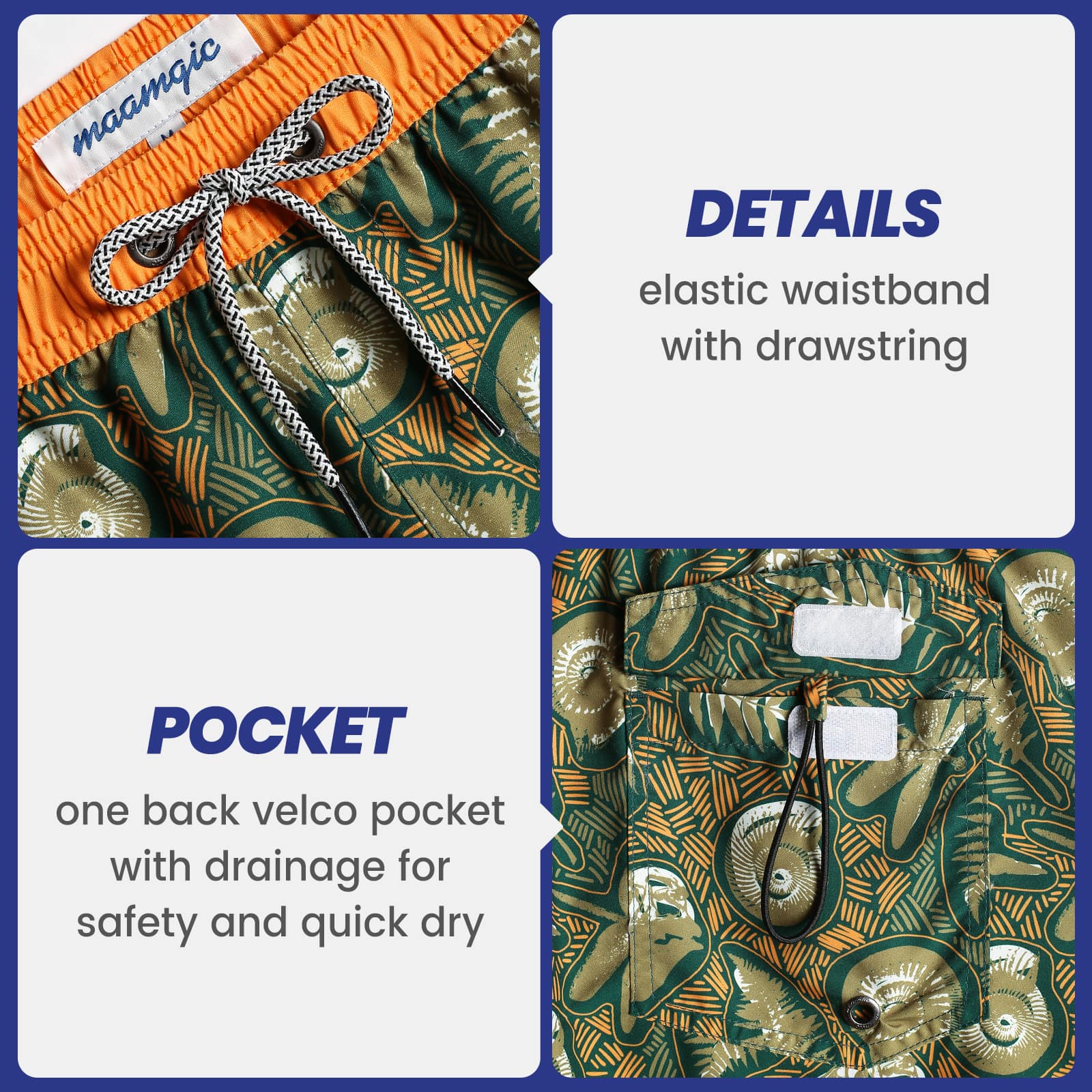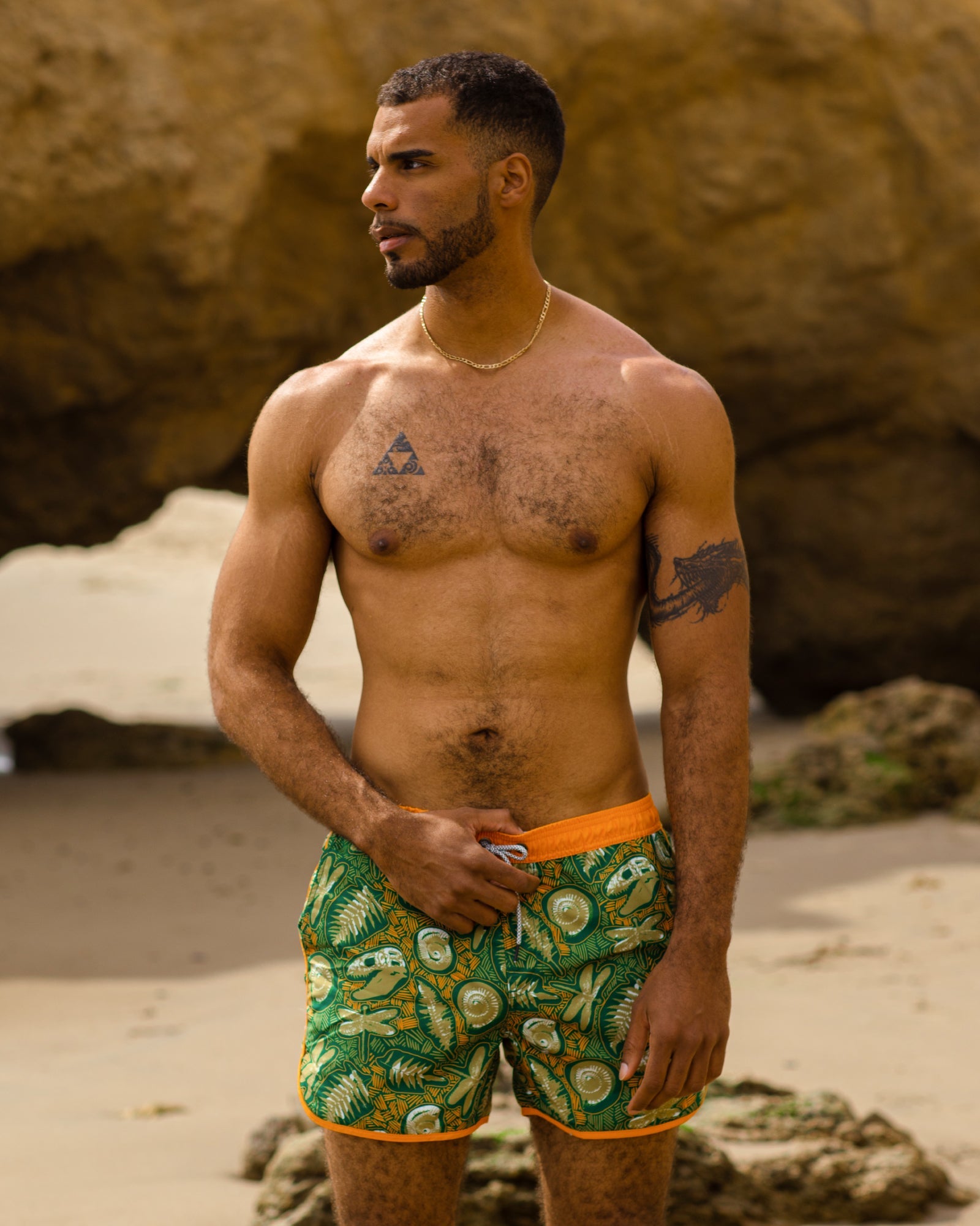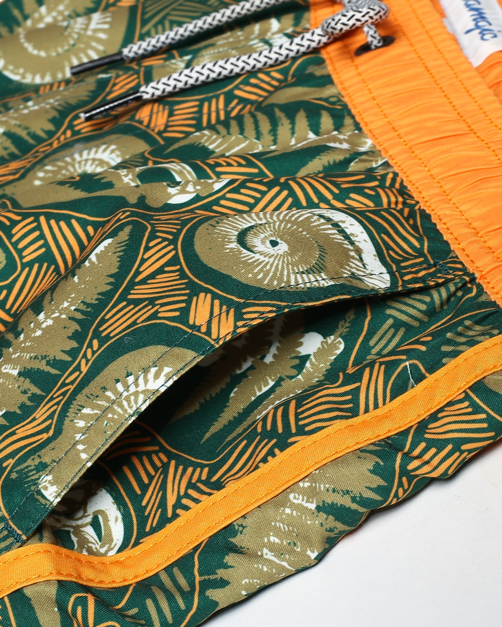 Unleash your wild side with our Men's 4.5" Vintage Swim Trunks. Featuring a bold dinosaur fossil and T-Rex skull print, these retro short swim shorts bring 90s vibes and quick-dry comfort to your summer adventures."