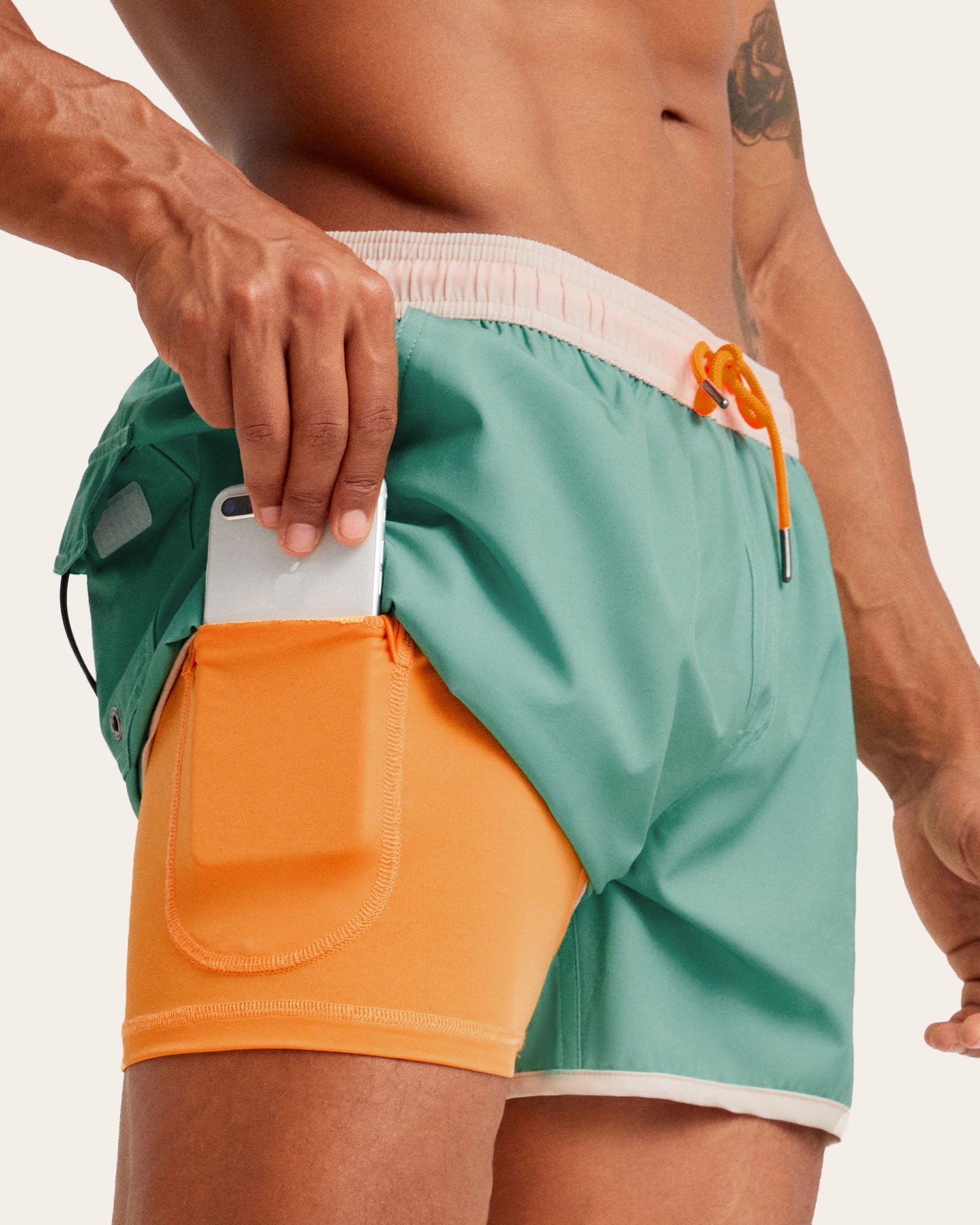 4.5-inch Men's swim trunks, featuring retro color-blocking inspired by '70s and '80s sporty vibes. The 2-in-1 design includes a soft inner compression liner for extra support and protection. Enjoy all-day comfort and bold vintage style for every beach adventure.