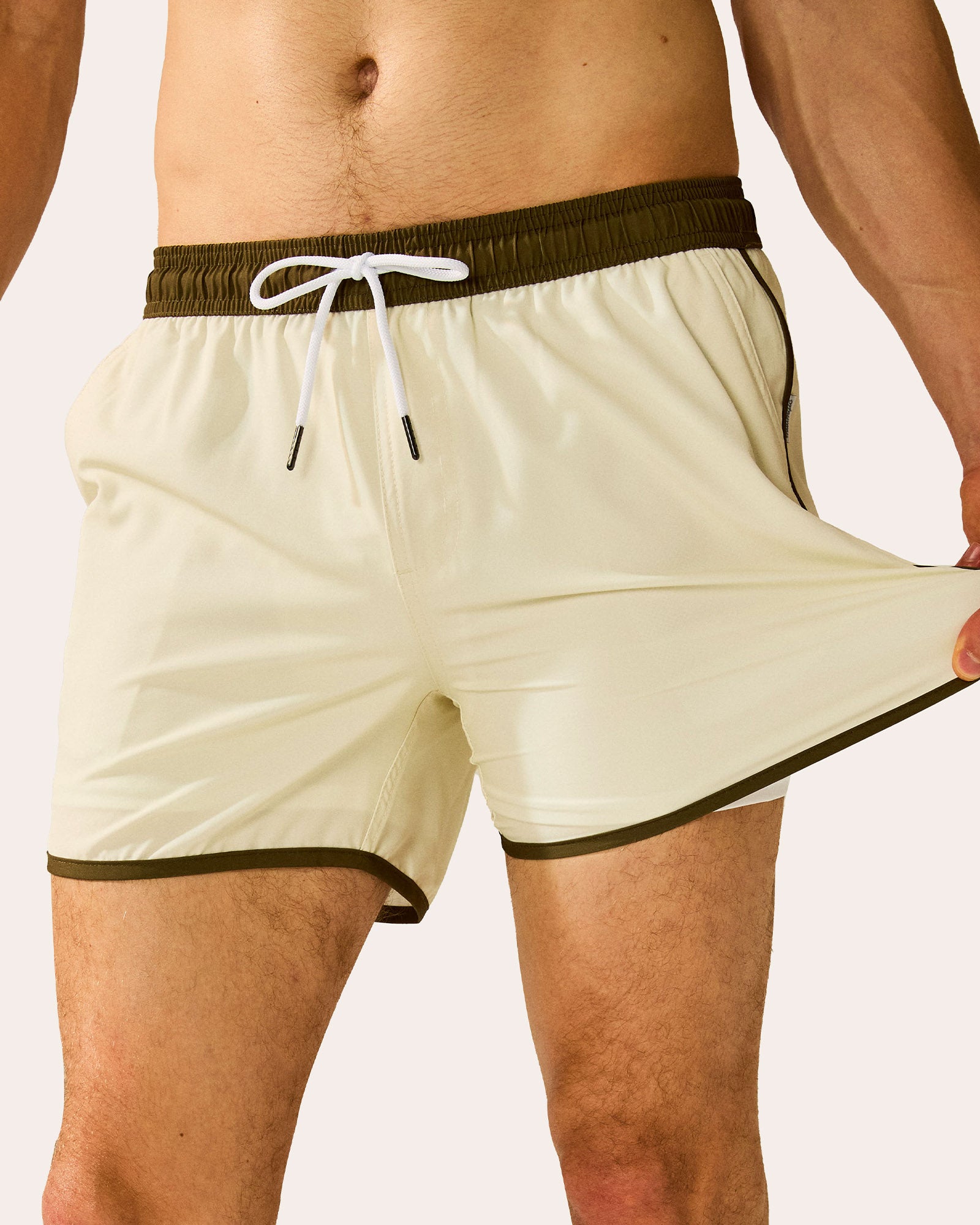 4.5-inch Men's swim trunks, featuring retro color-blocking inspired by '70s and '80s sporty vibes. The 2-in-1 design includes a soft inner compression liner for extra support and protection. Enjoy all-day comfort and bold vintage style for every beach adventure.