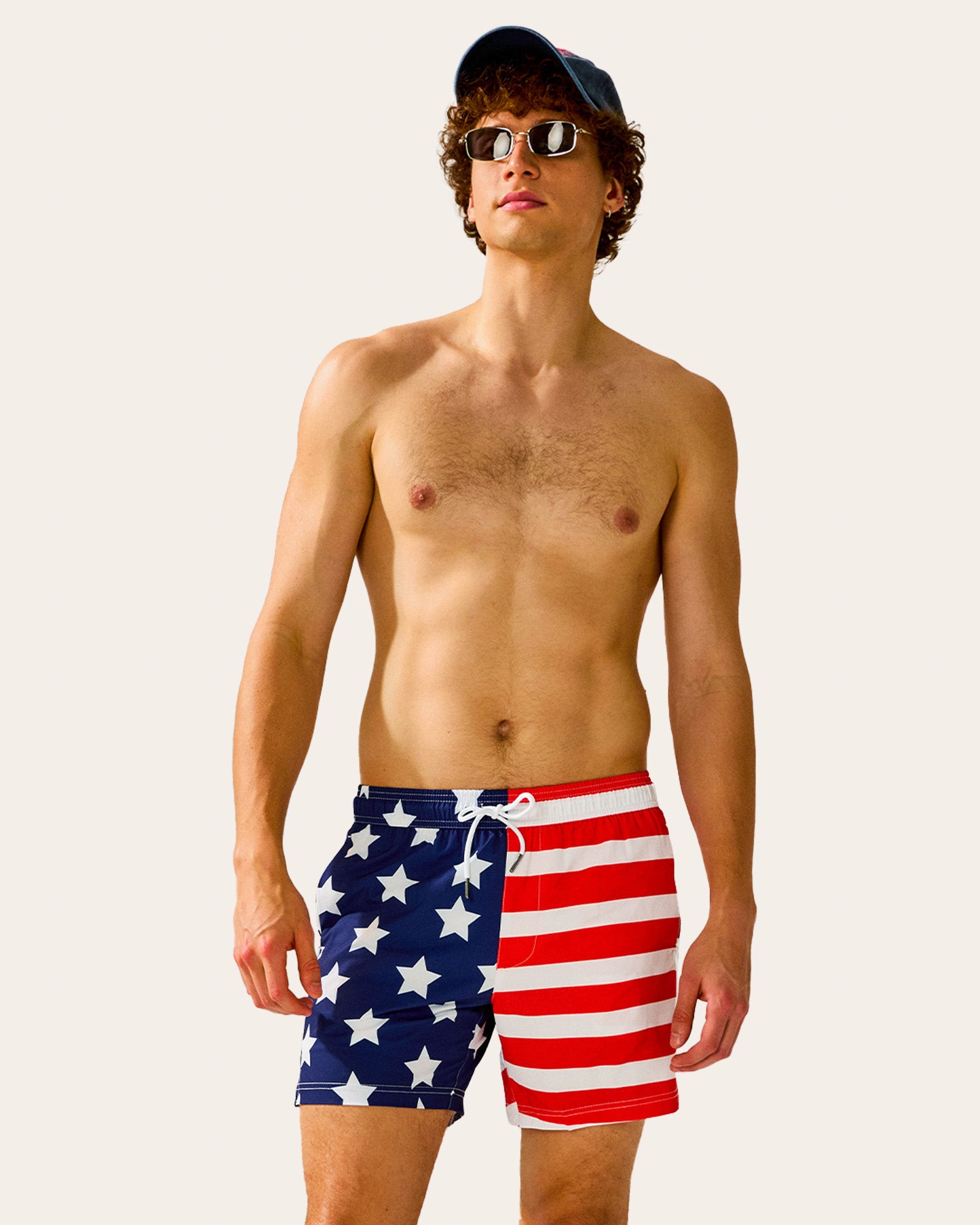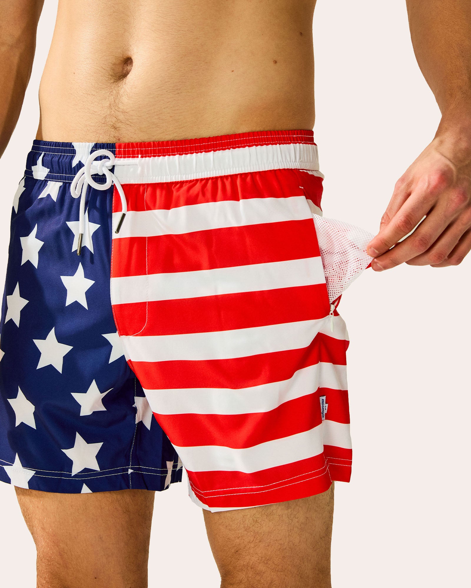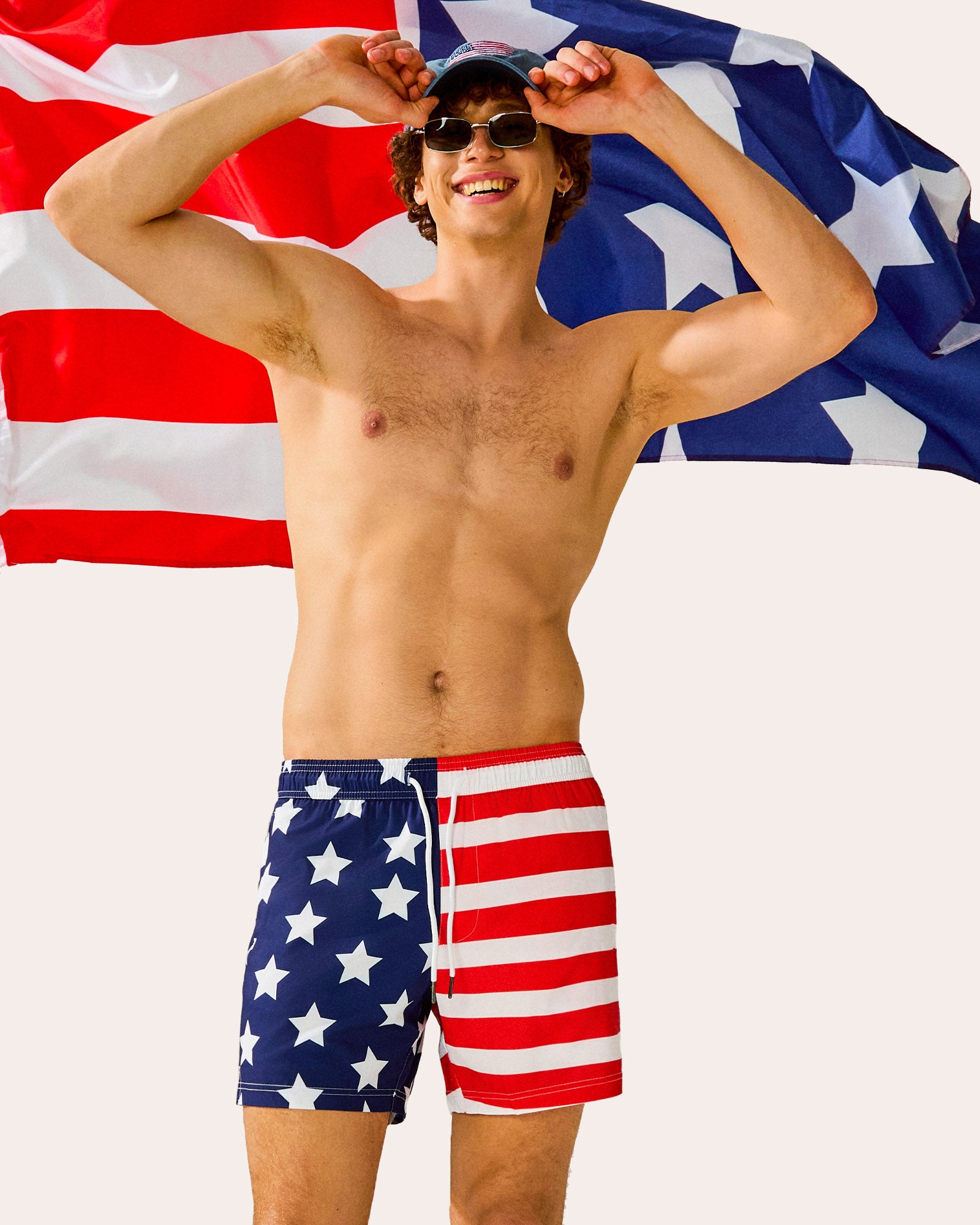 AmeriCool Flag Swim Trunks feature a bold and patriotic stars-and-stripes design, perfect for showing your pride this summer. Made from stretchy, quick-drying fabric, they’re ideal for beach days, poolside fun, or any outdoor celebration.
