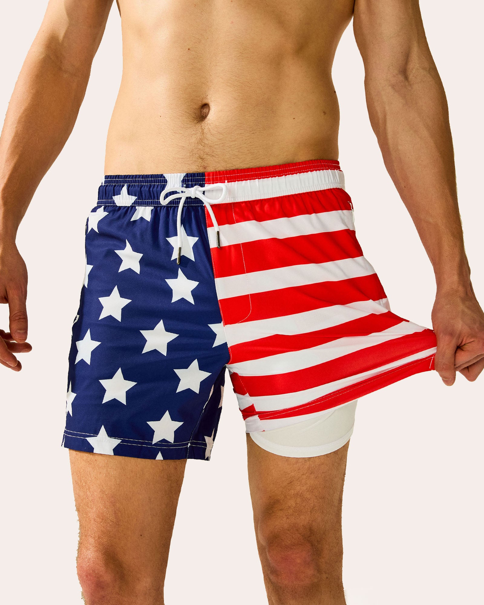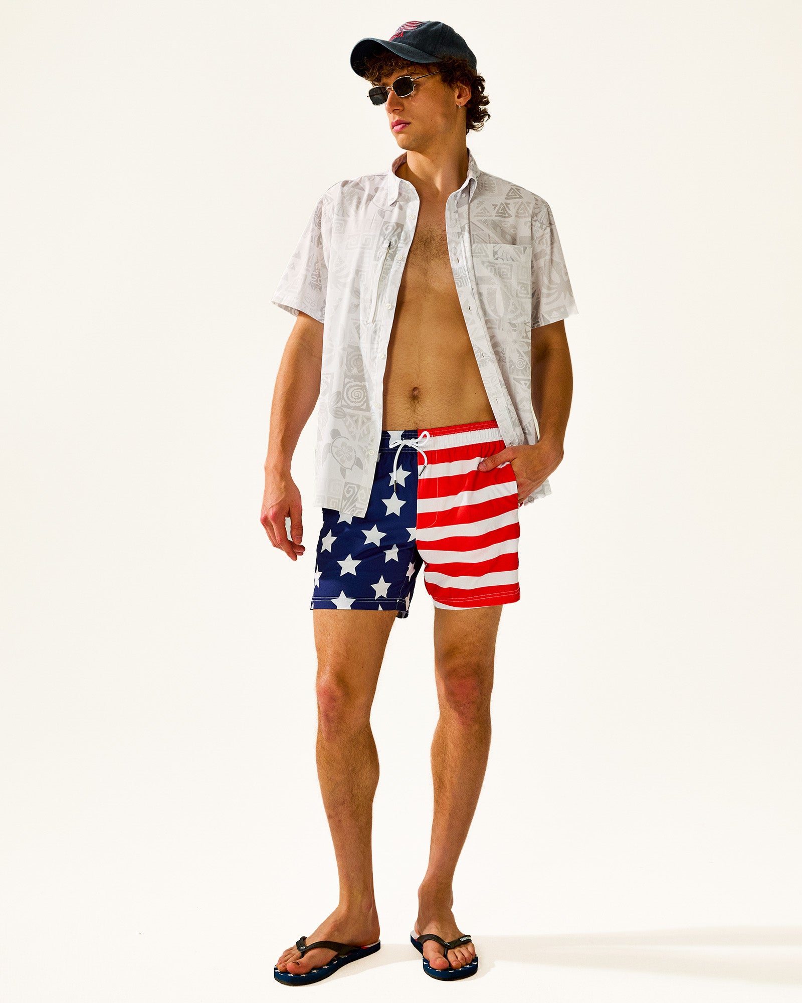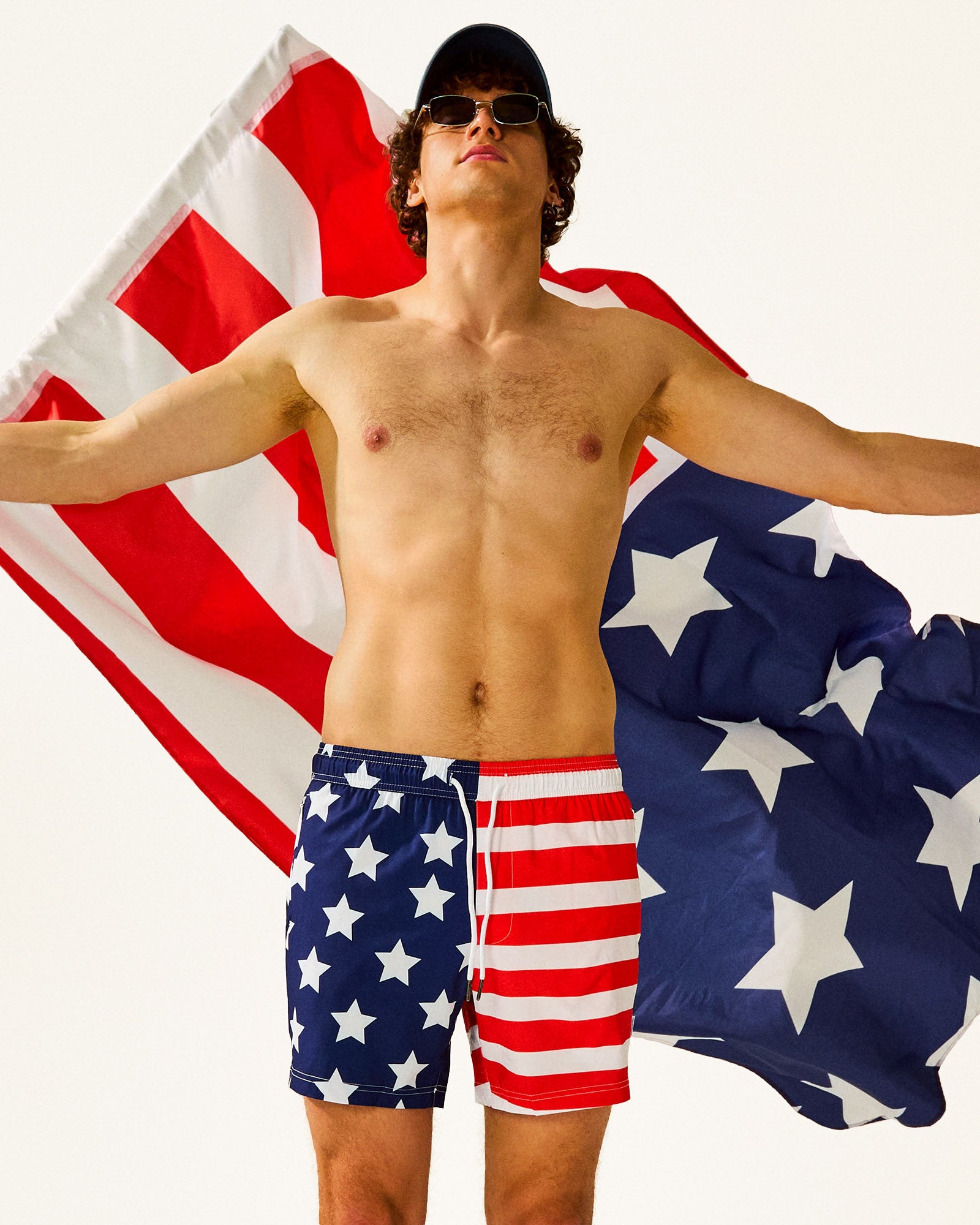 AmeriCool Flag Swim Trunks feature a bold and patriotic stars-and-stripes design, perfect for showing your pride this summer. Made from stretchy, quick-drying fabric, they’re ideal for beach days, poolside fun, or any outdoor celebration.