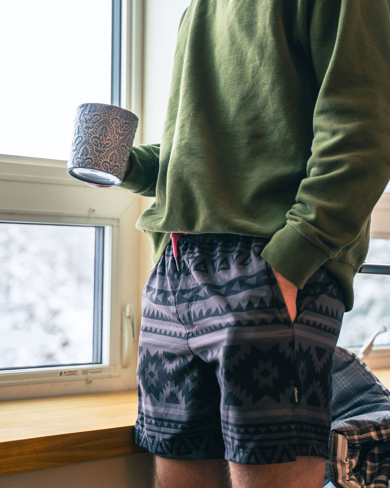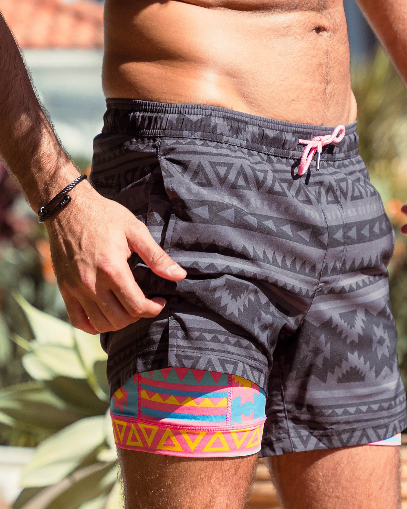 Ease into summer with swim trunks that balance calm style and bold spirit. A minimalist outer shell reveals a vibrant geo print lining. Perfect for beach days, poolside lounging, or spontaneous getaways. Comfort meets surprise in every splash and step.