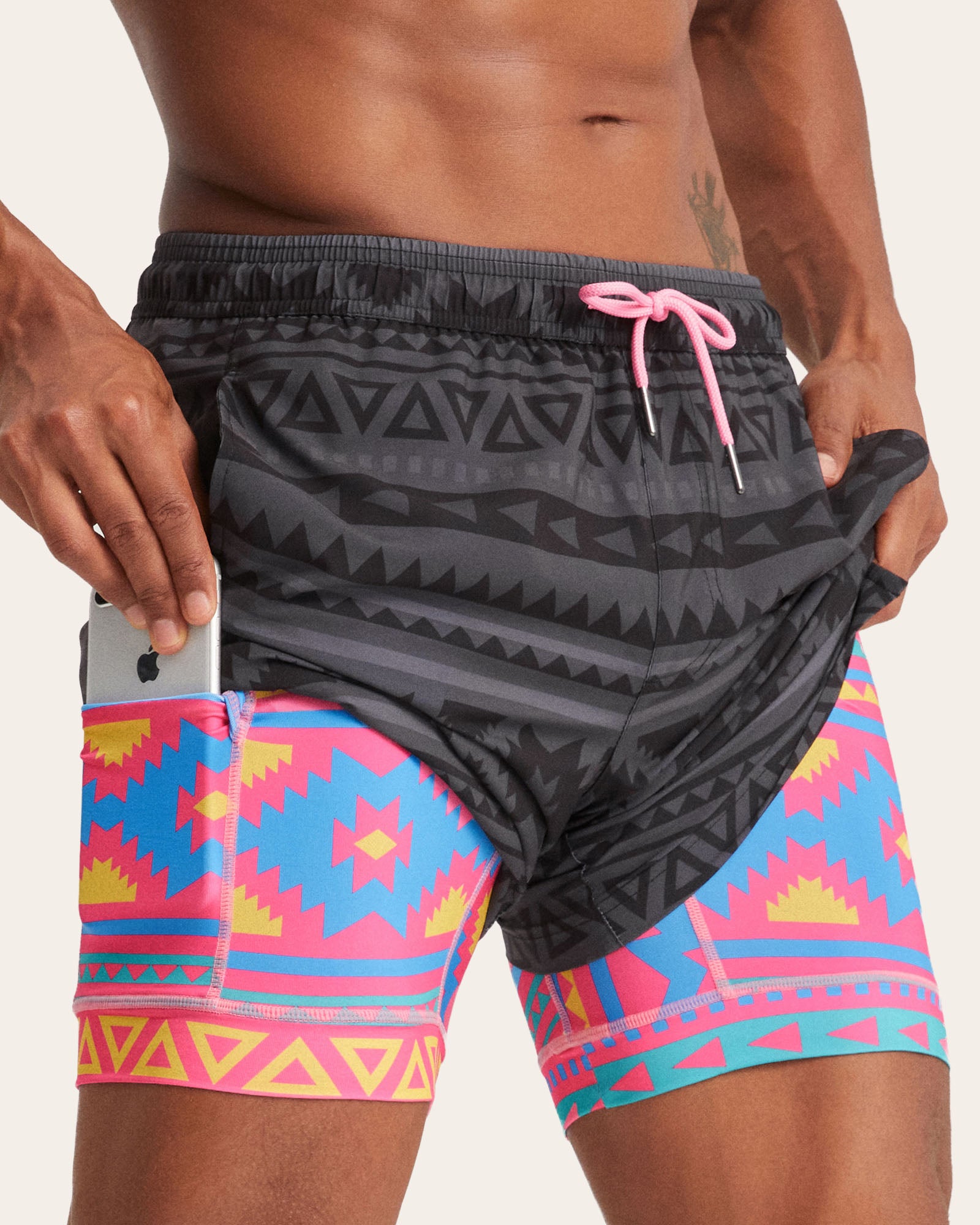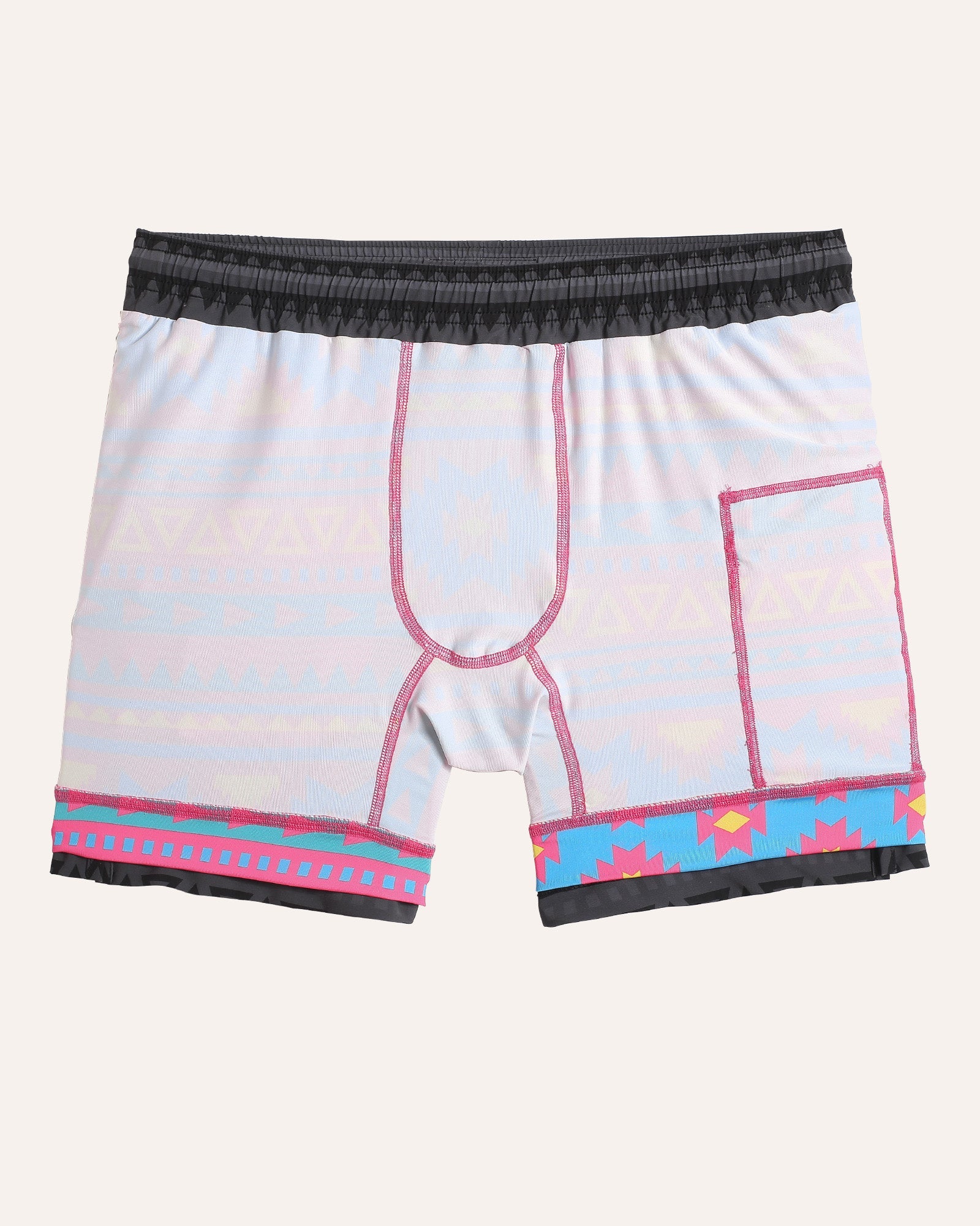 The FlipFlicker Pink Compression Lined Swim Trunks features a colorful Aztec-inspired inner liner with vibrant geometric patterns. Lightweight, quick-drying, and eye-catching, perfect for beach days, pool parties, and vibrant summer adventures.