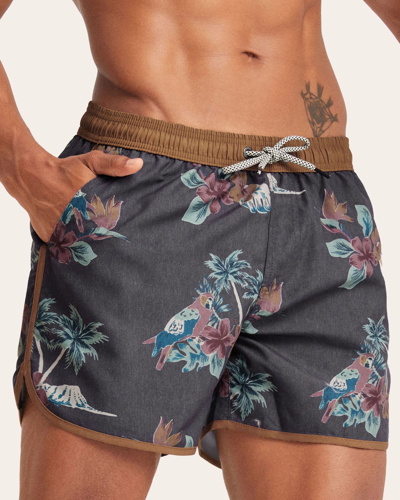 Featuring a parrot-and-floral print inspired by traditional Chinese painting, these swim trunks blend graceful artistry with a natural, refined look. Crafted from quick-dry fabric with breathable ventilation grommets and a soft mesh liner, they offer comfort at the beach or pool.
