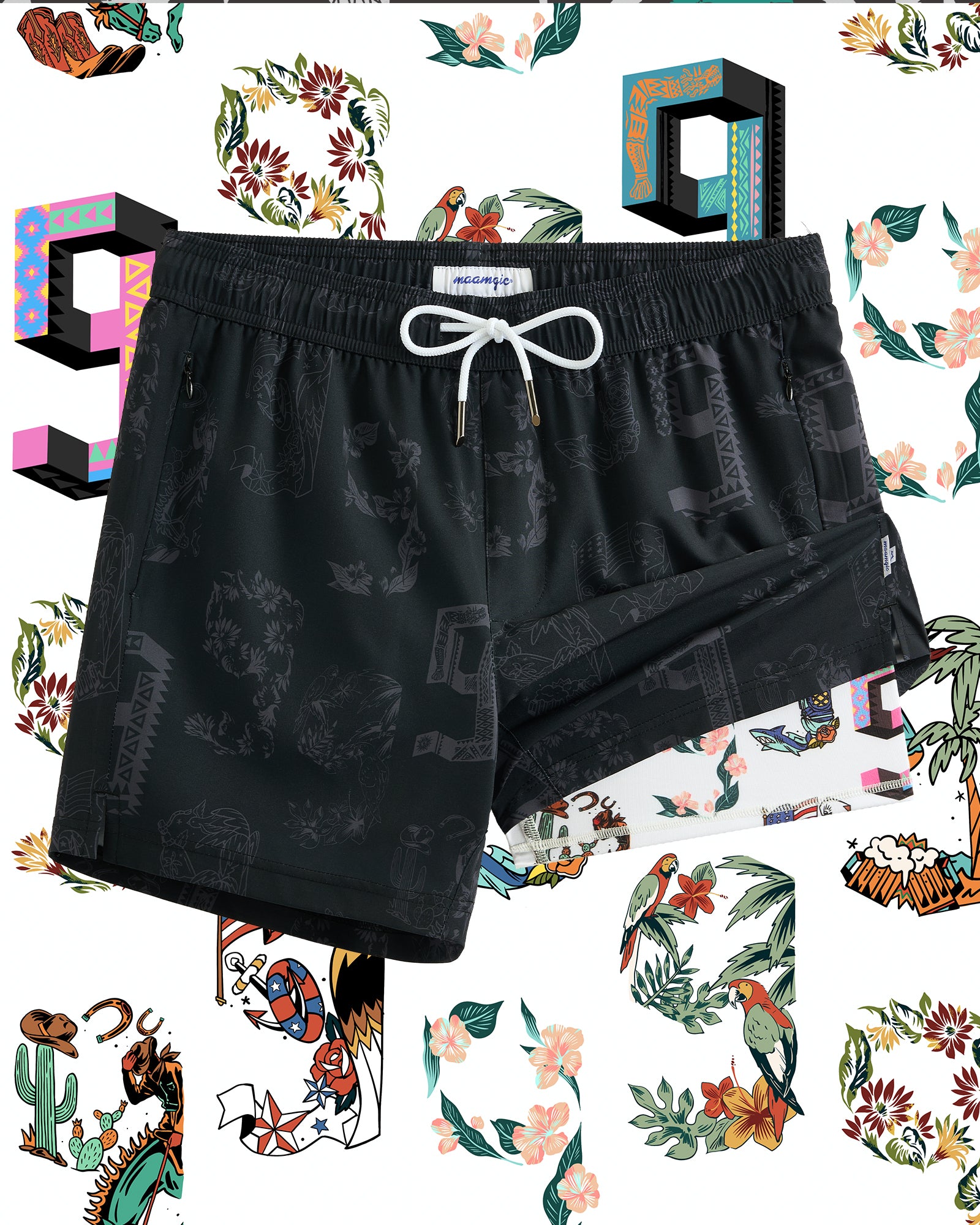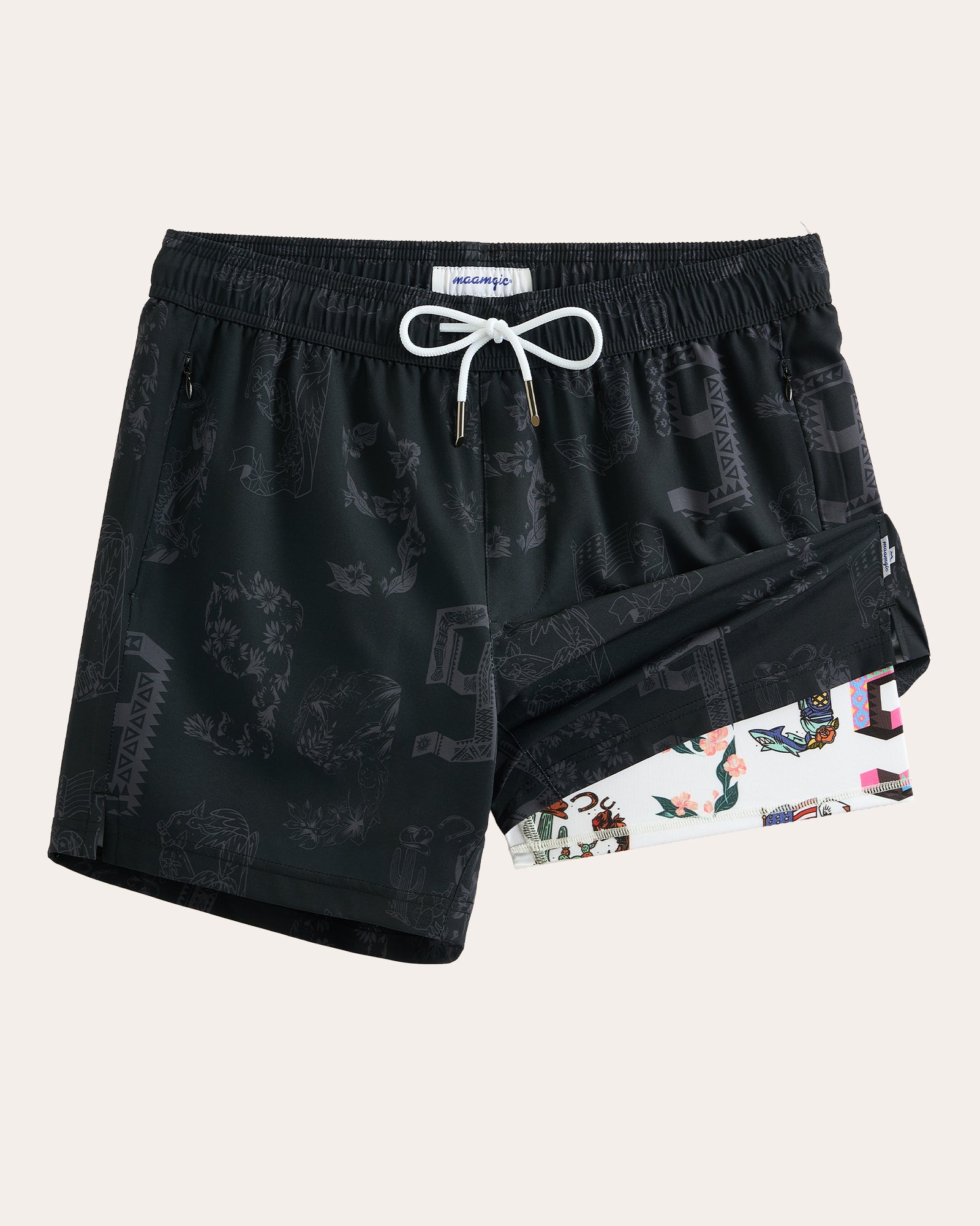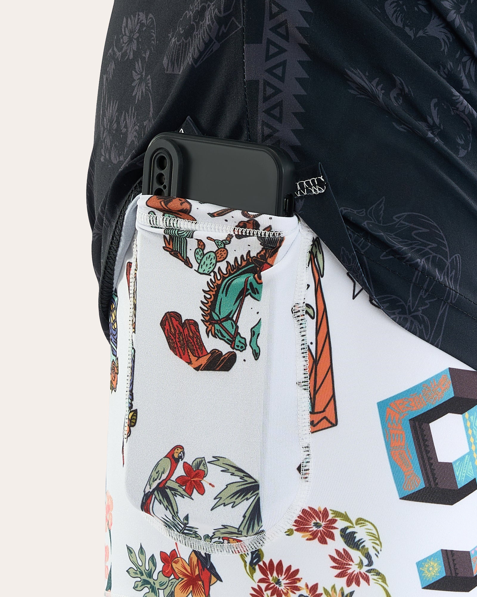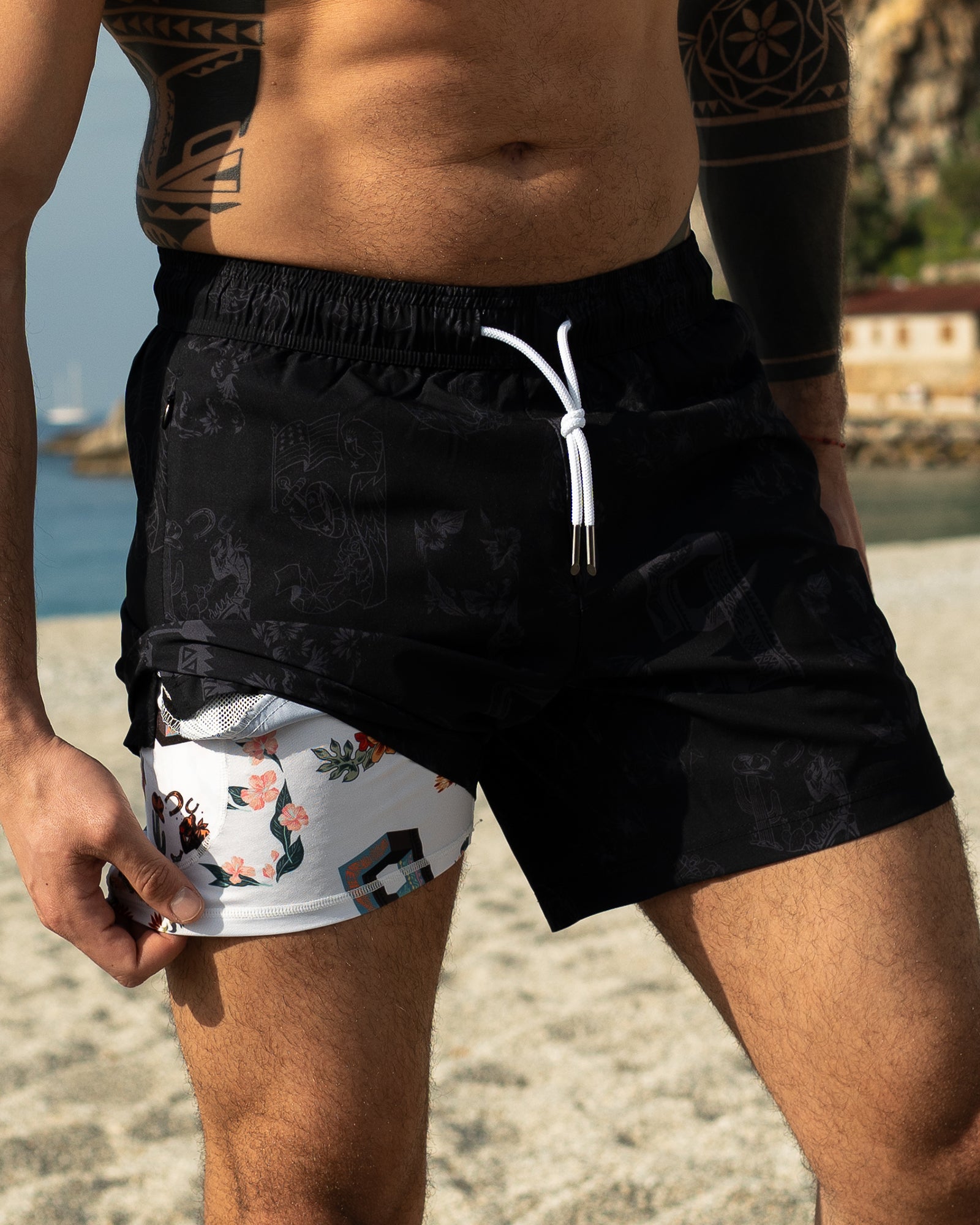 Master the art of the reveal with TribalTime. These 2-in-1 shorts feature a sleek, tonal black tribal print, hiding a vibrant colorful liner for an unexpected pop of joy. Built with 4-way stretch and anti-chafe support, it's where functional performance meets bold fashion.