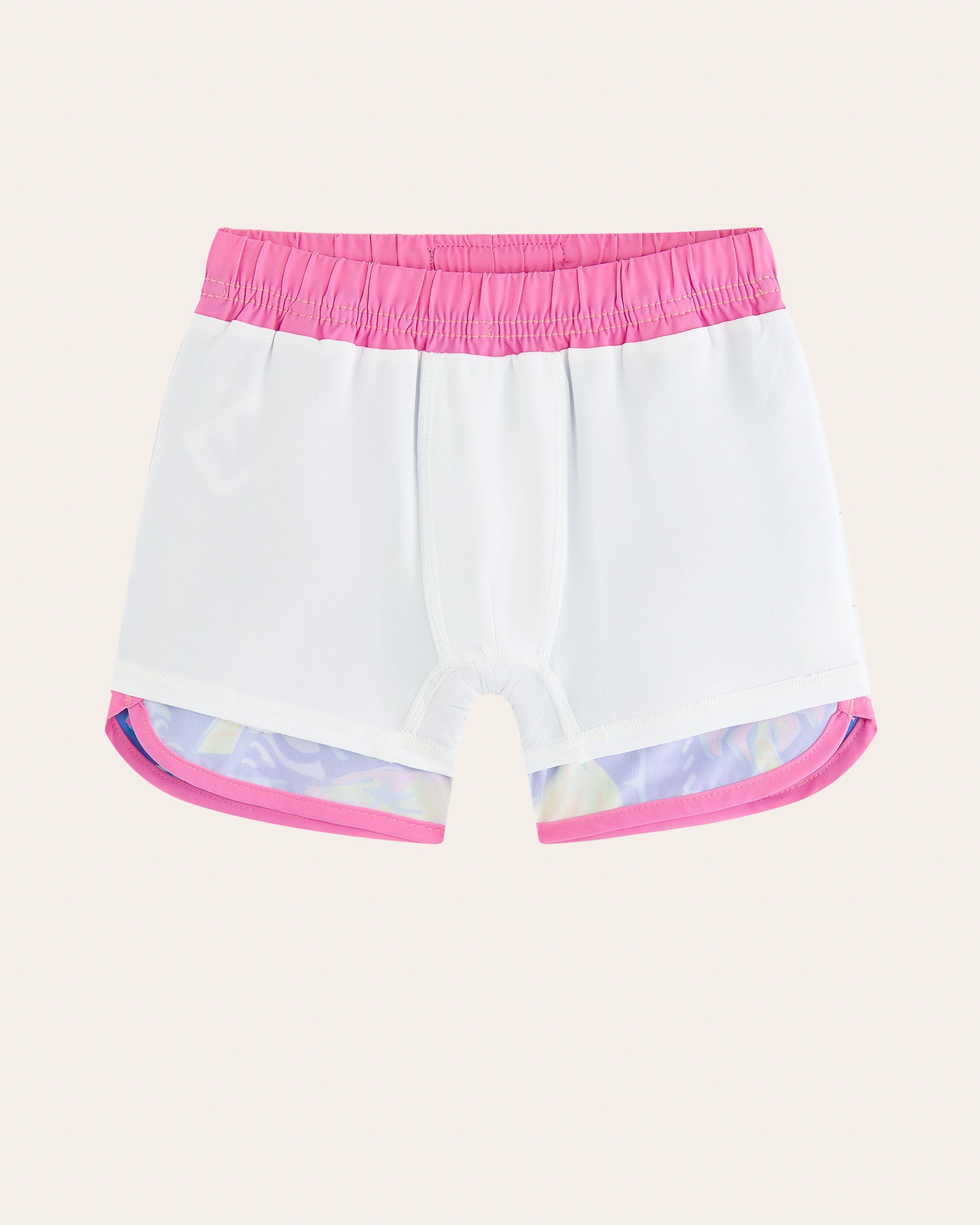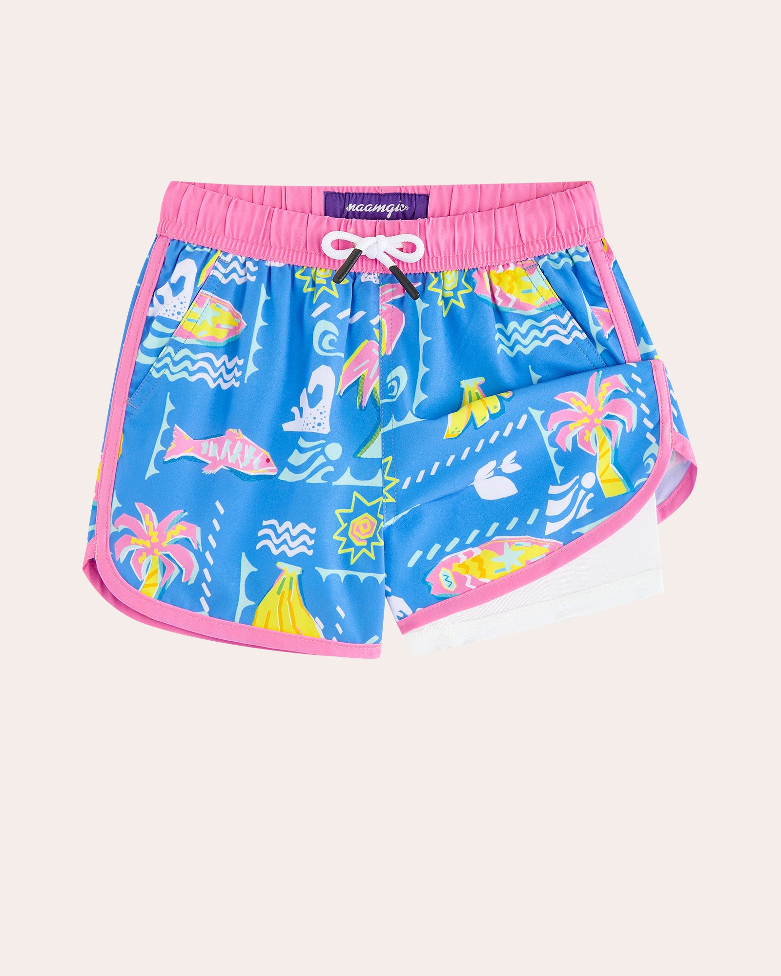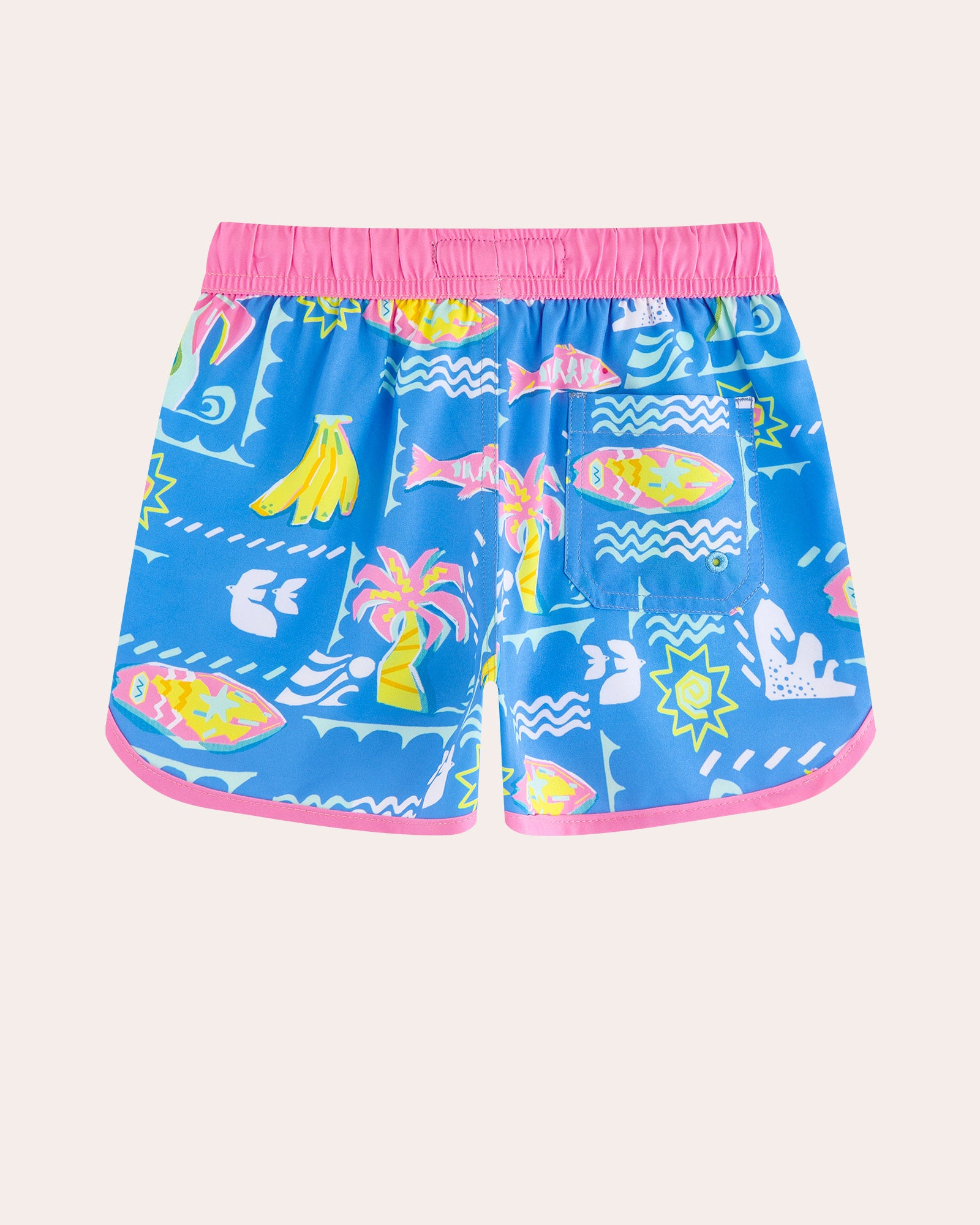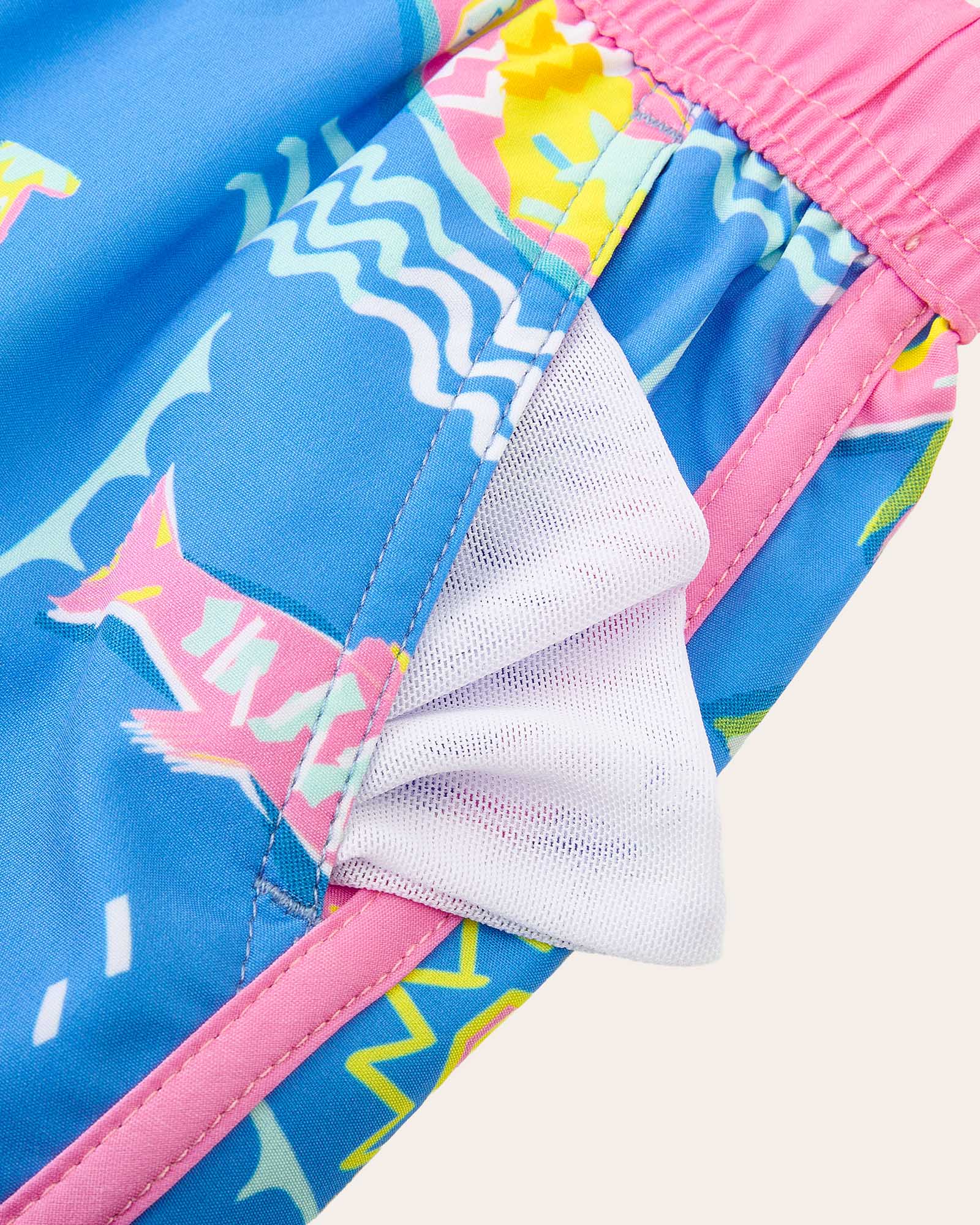 Ready for a tropical takeover? Our WavyWoo Kids trunks feature a bold blue-and-pink splash of pineapples and surfboards. The silky 2-in-1 liner keeps him rash-free, while the high-stretch fabric ensures boys can run, jump, and splash with total freedom. Style meets play in every stitch.
