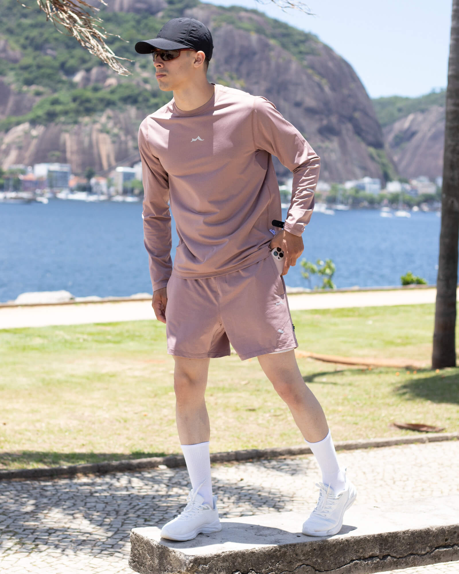 Wear the long-sleeve top with joggers. Ideal for cooler weather and outdoor activities.