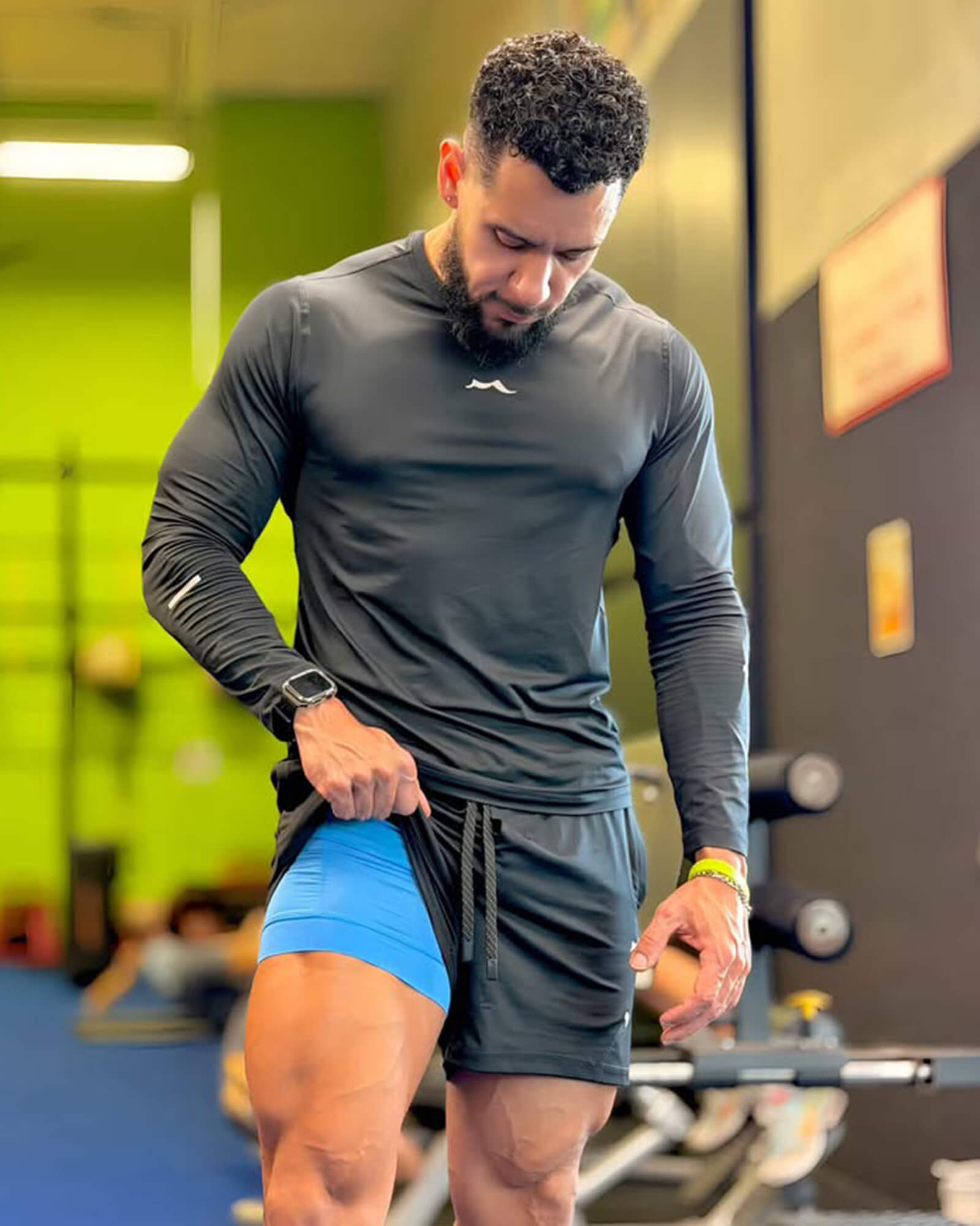 2. High-sweat strength training. We recommend the long-sleeve top with shorts, offering better ventilation while maintaining coverage during intense workouts.